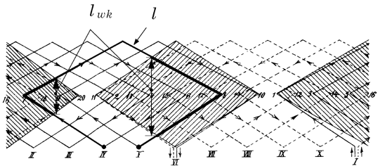 Länge ![]() Bild 7 : Prinzip der Gleichstromscheibenwicklung (Läufer) mit evolventen Leiteranteilen, in denen ein großer unwirksamer Leiteranteil enthalten ist und die Maschinenfläche nur zu etwa 50% genutzt wird