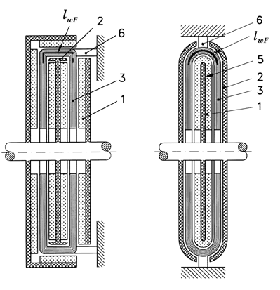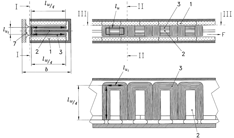 Ein zentrales Merkmal für die neue Maschinenkonstruktion ist, dass die eisenfreie zweipolige Luftspule, im Schnitt quer zur Bewegungsrichtung gesehen, um einen mittleren Körper der Feldeinrichtung ein oder mehrfach gefaltet ist, mit dem Ziel der maximalen Nutzung des Kupfers innerhalb jeder Spule, was sich in der Größe in dem Verhältnis der wirksamen Länge lw zum unwirksamen Leiter lu bzw. in dem Spulenausnutzungsgrad x Sp ausdrückt. Eine Verbesserung des Spulenausnutzungsgrades wirkt sich nahezu auf alle Eigenschaften der Maschinen in einem hohen Maß positiv aus und wird deshalb hier sehr hervorgehoben. Das zweite zentrale Merkmal liegt darin, verbliebene unwirksame Leiter aus Bereichen hoher Geschwindigkeit zu eliminieren, wo sie wertvolle Maschinenfläche besetzen und da auch erhebliche elektrische und mechanische Verluste, wie z.B. eine große elektrische und mechanische Zeitkonstante, Fliehkraftprobleme, wesentliche Durchmesservergrößerungen bei Schreiben oder der axialen Länge bei Trommeln, verursachen. Ein weiteres Ziel dabei ist, kompakte und leistungsstarke Maschinen mit hoher Effizienz zu bekommen. Mit diesem Konzept erreicht man ungeahnte Vorteile. Quantensprung durch Verdoppelung der wirksamen LeiterlängeDiese Ziele werden für eine Linearmaschine (Bild 11) durch eine einfache Faltung der Spulen um eine Rückschlussplatte erreicht. Die wirksame Länge lw verdoppelt sich bei geringfügig erhöhtem unwirksamen Leiteranteil lu im Faltbereich 7, bei gleichbleibender Maschinenbreite b, quer zur Bewegungsrichtung, gegenüber einer herkömmlichen Linearmaschine (Bild 3). ![]()
