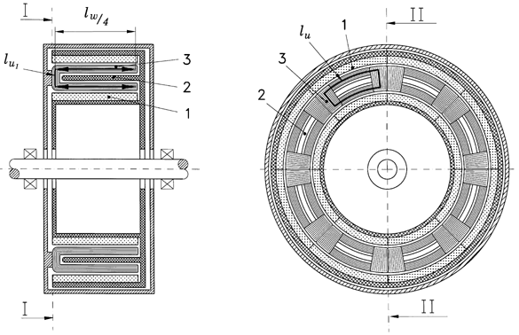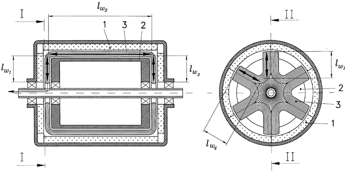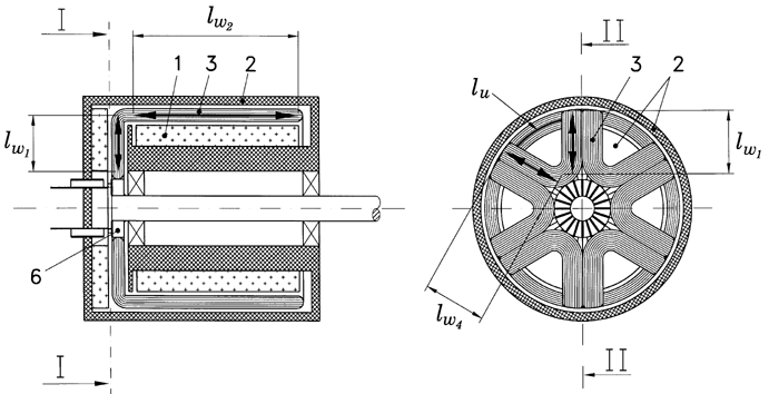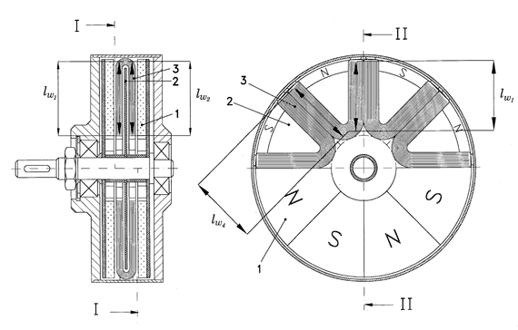 Bild 11: Linearmaschine in drei Schnittansichten entlang der Schnittlinien I-I,II-II,III-III Wie später in Bild 17,18,19,20 beispielhaft für Scheibenmaschinen gezeigt wird, bestehen zusätzlich Möglichkeiten, auch den Faltbereich der Spule noch wirksamer zu nutzen. Dies gilt auch für die folgende Doppel-Glockenmaschine:Lässt man die gefaltete Spulenkonfiguration der Linearmaschine wie in Bild 11 nun relativ zur Feldeinrichtung rotieren, bekommt man die Doppelglockenmaschine (Bild 12), die auch die doppelte wirksame Leiterlänge lw gegenüber einem herkömmlichen Glockenläufer (Bild 2), bei gleicher axialer Maschinenbreite, aufweist. Bild12: Doppelglockenmaschine in zwei Schnittansichten entlang der Schnittlinien I-I,II-II Da es bei den herkömmlichen Glockenläufern aus Fliehkraftproblemen unmöglich ist, die axiale Ausdehnung der Wicklung zu vergrößern, ist hier die Faltung die ideale Lösung, um bei gleicher axialer Länge das wirksame Kupfer zu verdreifachen und damit den Spulenausnutzungsgrad x Sp wesentlich zu verbessern. Durch diese konstruktive Gestaltung kann man, bei der maximal möglichen axialen Länge der Maschine, die Leistung mehr als verdoppeln, wobei die Effizienz der einzelnen Spule wesentlich vergrößert ist. So bekommt man die doppelte wirksame Länge bei gleichbleibender unwirksamer Länge. Hierbei ist eine Nutzung des Faltbereiches z.B. nach Vorschlag des Bildes 18 vorrausgesetzt. Aber selbst ohne diesen Mehraufwand an Polen im Faltbereich sind diese unwirksamen Leiter, bei diesen Polweiten, wesentlich kürzer als die Wickelköpfe. Dies ist relevant im Vergleich zu zwei ineinandergeschachtelten Glockenläufern, mit jeweils einer herkömmlichen Wicklung. Auch würde bei einer Vergrößerung der Polweite, in der Maschine von Bild 12, der Zuwachs von Wickelkopflängen, innerhalb der Spule, nur halb so groß sein, als bei herkömmlichen Glockenläufern. Bei einer Schrägwicklung nach Bild 10 macht sich der verbesserte Spulenausnutzungsgrad dadurch bemerkbar, dass die Leiter bei gleichbleibender Polweite wesentlich steiler (also effektiver) zur Bewegungsrichtung liegen, was z.B. bei Stellmotoren zu hohen Drehmomenten und einer Leistungssteigerung führt, sowie die bessere Spulenausnutzung zu einer verbesserten mechanischen und elektrischen Zeitkonstante und damit zu großer Dynamik führt. Auch der Wirkungsgrad und das Leistungsgewicht ist erhöht, was bedeutend für batteriebetriebene und tragbare Geräte ist. Man könnte auch die Schrägung der Wicklung der herkömmlichen Maschine beibehalten, was bei Gleichstrommaschinen zu einer Halbierung des Kommutierungsaufwandes führt, weil die doppelte Polweite mit jeder Spulenseite überstrichen wird. So zieht eine Verbesserung des Spulenausnutzungsgrades bei jeder Ausgestaltung der konstruktiven Grundform (hier Doppelglockenform) eine Vielzahl von Vorteilen, die individuell von der Anwendung abhängt, nach sich. Generell bewirkt seine Verbesserung eine Steigerung der Leistung, des Drehmoments, des Leistungsgewichtes, des Leistungsvolumens und des Wirkungsgrades. Individuelle Vorteile von Ausgestaltungen sind in den Kapiteln "Weitere Vorteile und Aufbauvarianten" und "Anwendungen" auf S.16-17 zusammengefasst und an einem Beispiel veranschaulicht. Quantensprung durch Verkürzung der unwirksamen LeiterEin weiteres Merkmal der neuen Maschinenkonstruktion ist, die Faltung der Spule dazu zu nutzen, die langen Wickelkopfleiter bzw. Leiter, die zwei Spulenseiten im Umfangsbereich verbinden, bei rotierenden Maschinen in den achsnahen Bereich zu legen, um somit den unwirksamen Leiteranteil erheblich zu verkürzen und die wirksame Länge um 2 x lw1 zu vergrößern. Die Achsannäherung kann einseitig, d.h. nur für einen Wickelkopf geschehen, so dass man eine glockenförmige Wicklung mit ihren Vorteilen bekommt, wie in Bild 13 ersichtlich. Bild 13 Gleichstrom- Glockenläufermotor in zwei Schnittansichten der Schnittlinien I-I,II-II Im Schnitt I ist die Verkürzung der achsnahen verbindenden Leiter, mit einem minimalen unwirksamen Anteil (explizit dargestellt ist dies in Bild 16) im Vergleich zu dem langen im Umfangsbereich verbleibenden unwirksamen verbindenden Leiter lu, gut sichtbar. Zu dem haben die nun sehr kurzen, die Spulenseiten verbindenden, achsnahen Leiter, aufgrund ihrer Lage (hier bogenförmig), noch einen wirksamen Anteil lwk in Abhängigkeit der Spulenweite, der den Spulenausnutzungsgrad x Sp weiter verbessert (siehe dazu Bild 16). Für Spulenläufer spart diese Achsannäherung gegenüber einem herkömmlichen Glockenläufer (Bild 2) zusätzlich noch Kupferlängen ein, die dafür notwendig wären um die im Umfangsbereich liegenden Spulen mit dem Kommutator zu verbinden. Schrägwicklungen können bei dieser Maschinenform in Bild 13 ebenfalls mit den gleichen Vorteilen verwendet werden, wobei die Leiter zusätzlich vorteilhafterweise, im sich der Achse annähernden Bereich, nahezu radial verlaufen und somit hochwirksam sind. Man spart also in zweifacher Hinsicht Leitungskupfer, einerseits durch die verkürzende Wirkung der Achsannäherung auf die unwirksame Länge lu innerhalb der Spule und andererseits durch das Überflüssigwerden von langen Leitern zwischen Spulen und Kommutator. Darüber hinaus liegt der Leiter wirkungsvoller zur Bewegungsrichtung und natürlich ist auch bei dieser Maschine, wie zuvor beschrieben, durch die Faltung eine Verlängerung der wirksamen Leiterlänge auf engem Raum erreicht, so wie in allen vorgestellten Maschinen. Für Glockenläufer ist dies eine gute Möglichkeit den Spulenausnutzungsgrad zu erhöhen und die Maschine wesentlich leistungsstärker zu machen. Der rautenförmige wirksame Leiterbereich verteilt sich hier auf beide Luftspaltabschnitte, wobei sich für den scheibenförmigen Luftspaltbereich kreissegmentförmige Polformen ergeben und für den hohlzylindrischen Luftspaltbereich dreiecksförmige. Quantensprung durch volle Umsetzung der IdealbedingungenDer nächste Entwicklungssc