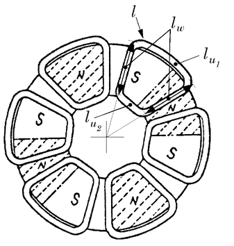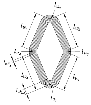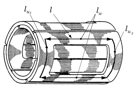 In Bild 9 ist dies für eine Wicklungsausführung einer Trommelmaschine gezeigt, die in abgewickelter Form auch für Linearanwendungen gilt. Bild 9: Trommelwicklung mit wirksamen und unwirksamen Leiteranteilen In Bild 10 ist die geringe wirksame Leiterkomponente lwk für eine Leiterschleife l der Schrägwicklung eines Glockenläufers ersichtlich.Bild 10: Schrägwicklung eines Gleichstromglockenläufermotors