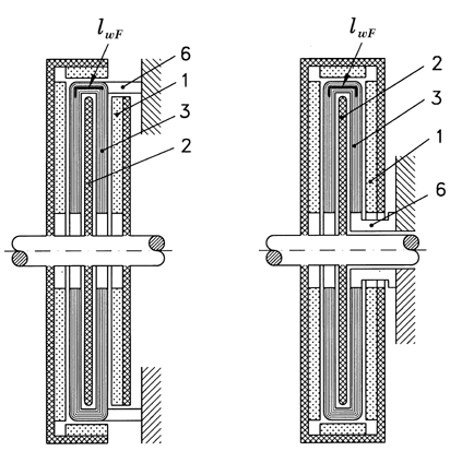 direkt ineinanderübergehenden In den Abbildungen (Bild 4 bis 6) wird das neue Grundkonzept gut ersichtlich. Der Luftspalt, in dem die Wicklung verläuft, verändert im Schnitt quer zur Bewegungsrichtung seine Richtung. Dies kann so wie in Bild 6 sein, in dem der Luftspalt mit nahezu ununterbrochener Wirksamkeit seine Richtung ändert, oder wie in Bild 4 und 5, in denen sich der Luftspalt in zwei oder mehrere Abschnitte (4',4'' und ggf. 4''') teilt, die aber so dicht beieinander liegen, dass die Spule gar nicht oder nur in den sehr kurzen Bereichen der Faltung durch einen feldfreien Raum verläuft. Jede Luftspule der Wicklung folgt, im Schnitt quer zur Bewegungsrichtung, dem Verlauf des Luftspaltes und ist damit ein oder mehrmals um einen mittleren Körper 5 der Feldeinrichtung, der in diesen Darstellungen jeweils ein verschieden geformter Rückschluss 2 ist, im Faltbereich 7 gebogen oder gefaltet. Die Faltung geschieht in Abhängigkeit von der Anwendung und der konstruktiven Absicht auf verschiedene Weise, die jede für sich in Verbindung mit einer linearen oder einer rotierenden Bewegung ihre Vorteile bietet. Die sich im Luftspalt befindende Wicklung kann sowohl als Synchron als auch als Asynchronwicklung aufgebaut sein. Der Aufsatz beschränkt sich hier auf die Darstellung von Synchronmaschinen und dabei im wesentlichen auf kommutierte Maschinen. Ein wesentlicher Bestandteil der neuen Maschinen liegt in der Eisenfreiheit der Wicklung. Deshalb wird zunächst auf deren Vorteile eingegangen und anschließend auf die Grenzen und Nachteile bestehender eisenfreier Luftspulenmaschinen, bevor das neuen Maschinenkonzept mit seinen Entwicklungssprüngen anhand von Konstruktionsformen einzelner Maschinen gezeigt wird. Vorteile eisenfreier Luftspulenmaschinen im AllgemeinenDie zentrale Ursache der meisten Vorteile herkömmlicher eisenfreier Luftspulenmaschinen liegt in der Eisenfreiheit der Wicklung. Dadurch entfallen die Eisenverluste, die sonst im Spulenkern entstehen. Auch die Induktivität der Spule sinkt erheblich durch den fehlenden Kern. Die Masse der Luftspule und damit das translatorische und rotatorische Trägheitsmoment sind gering. Die Maschinen haben je nach Bewegungsart eine lineare Spannungs-/Bewegungs- (bzw. Drehzahl-) Kennlinie und Strom-/Kraft- (bzw. Drehmoment-) Kennlinie. Aus diesen Punkten entstehen weitere Vorteile. Die mechanische und die elektrische Zeitkonstante ist klein und Wendepolwicklungen können entfallen. Das Bürstenfeuer ist gering und die Bürstenstandzeiten sind lang. Das Leistungsgewicht und das Drehmomentengewicht sind groß. Die Ankerrückwirkung ist vernachlässigbar klein. Die Maschinen sind aufgrund der geraden Kennlinien sehr genau und mit einer hohen Dynamik regelbar und positionierbar und ihr Wirkungsgrad ist hoch. Die Maschinen haben eine geringe Störabstrahlung und eine hohe elektromagnetische Verträglichkeit (EMV) und sie haben ein klares, mathematisch berechenbares und kontrollierbares Verhalten, so dass die Motorkennwerte auch sensorisch zur Fehlererkennung genutzt werden können [2]. Sie haben eine gute Wärmeabfuhr und lassen deshalb große Stromdichten zu und sie haben keine Reluktanzmomente aufgrund von Nuten. Bei Scheibenmaschinen hat man die Vorteile der geringen axialen Länge und bei Trommel- und Glockenmaschinen, die des geringen Durchmessers. Grenzen und Nachteile bestehender eisenfreier LuftspulenmaschinenKonstruktive geometrische GrenzenAllerdings haben die geometrischen Formen der vorgestellten herkömmlichen Maschinen auch ihre physikalischen und elektrischen Grenzen. So ist eine Scheibenmaschine (Bild 1) aufgrund ihrer konstruktiven Form extrem darauf angewiesen, einen großen Durchmesser zu haben, weil es neben der Drehzahl der wesentliche Freiheitsgrad ist, die Leistung und das Drehmoment zu erhöhen. Dies ist ein Schwachpunkt dieser Maschinen, denn große Durchmesser sind aus Platzgründen in der Anwendung oft nicht akzeptabel. Des weiteren führen große Durchmesser bei hohen Drehzahlen zu Fliehkraftproblemen bei Spulenscheibenläufern, so dass die Durchmesser, die Drehzahlen und damit die Drehmomente und die Leistungen begrenzt sind. Bei Trommelmaschinen und besonders bei Glockenläufern (Bild 2), die eine nur einseitige axiale Spulenhalterung haben, bestehen aufgrund der Fliehkraftprobleme Begrenzungen der Wicklungsausdehnung, sowohl in ihrer axialen Länge, als auch im Durchmesser. Bei den Linearmaschinen (Bild 3) hat man den Nachteil, dass sich die Maschinenfläche nur in einer Ebene befindet, so dass man schnell zu großflächigen Maschinen kommt. Hohe KupferverlusteEin weiterer wesentlicher Nachteil dieser herkömmlichen Maschinen
