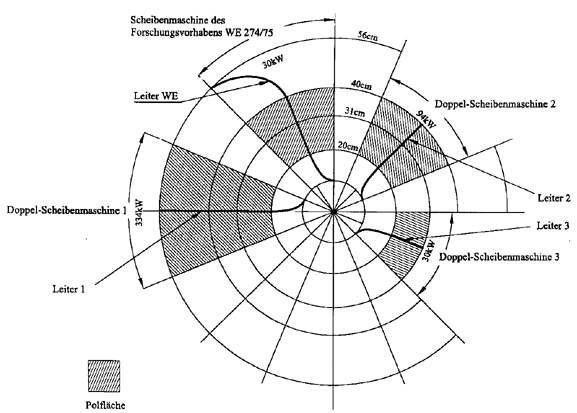 des Forschungsvorhabens WE 274/75 Ein Ergebnis der Untersuchung ist, dass im Umfangsbereich (zwischen 40 und 56 cm Durchmesser) eines Luftspaltes der erfindungsgemäßen Doppel-Scheibenmaschinen ein Vielfaches der Maschinenleistung, der herkömmlich genutzten Wicklungsteile (zwischen 20 und 40 cm Durchmesser) vollbracht wird und dies auf hocheffiziente Weise. Doppel-Scheibenmaschine 1:Somit kommt die Doppel-Scheibenmaschine 1 (Bild 21) kommt somit auf eine mehr als 11fache Leistung gegenüber der Maschine des Forschungsvorhabens, also auf 334kW, bei gleichem Maschinendurchmesser, gleicher Polzahl, Drehzahl, Wicklungszahl, Luftspaltbreite und Luftspaltinduktion, gleichem Leiterquerschnitt, also gleichen äußeren Bedingungen. Durch den parallel liegenden Luftspaltabschnitt und die teilweise Ausstattung des Umfangsbereiches der Doppel-Scheibenmaschine 1 mit magnetischem Feld, steigt der Magnetmaterialbedarf dabei nur auf das 4,5-fache. Die Maschine ist durch den zweiten Luftspaltabschnitt axial etwas länger. Dies ist aber alles, in Anbetracht des enormen Leistungszuwachses, der Effizienzsteigerung und der Verbesserung aller sonstigen Maschineneigenschaften, für die meisten Anwendungen akzeptabel. Der Wirkungsgrad der Doppel-Scheibenmaschine liegt aufgrund der vermiedenen