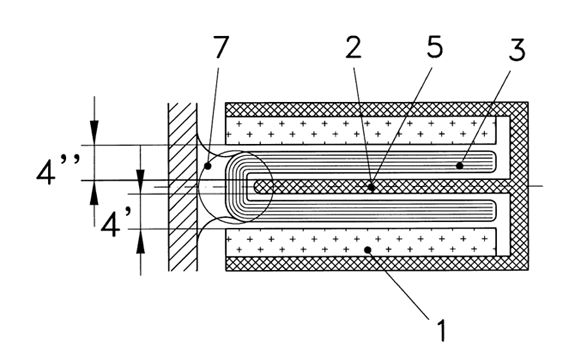 mit einer Einschichtwicklung Die magnetischen Pole sind ausgeprägt, elektromagnetisch oder permanentmagnetisch und ein oder beidseitig der Luftspule angebracht, wobei die Wicklung meistens mechanisch oder elektronisch kommutiert ist (DC-,EC-Motoren). Das Grundkonzept der neuen eisenfreien LuftspulenmaschinenEinige Grundformen des Spulenverlaufes der neu entwickelten Luftspulenmaschinen zeigen die Bilder 4 bis 6 als Schnittdarstellungen. Sie sind die Basis, sowohl für linear als auch rotierend arbeitende Weiterbildungen. Bild 4: Zwei Luftspaltabschnitte 4‘,4‘‘ liegen parallelund sehr dicht beieinander Bild 5: Zwei Luftspaltabschnitte 4‘,4‘‘ liegen unter einem Winkel dicht beieinander