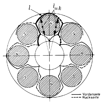 unter Das gleiche gilt für scheibenförmige Gleichstromwicklungen, wie in Bild 7, die neben rechtwinklig zur Bewegungsrichtung verlaufenden Leitern auch schräg oder evolvent verlaufende Leiteranteile haben, wobei der wirksame Leiterbereich, aufgrund des Wicklungsschemas, statt rautenförmig eine sechseckige Form hat. Diese ist in der sechseckigen Leiterbegrenzung des oberen Nordpols zu sehen, wobei sie hier nicht voll genutzt wurde, da einfachheitshalber runde Magnete verwendet wurden. Auch hier ist offensichtlich, wie viel Leiter ungünstig zur Bewegungsrichtung liegt und wie viel wirksame Polfläche und Maschinenfläche ungenutzt bleiben. Die Kupferverluste haben mehrere Nachteile zur FolgeZum einen steigt die Windungslänge der Spule l, ohne eine Vergrößerung der wirksamen Länge lw. Dies führt zu einer großen Masse, einem hohen Innenwiderstand, einer großen Induktivität und hält damit alle zuvor genannten positiven Eigenschaften der eisenfreien Luftspulenmaschinen in Grenzen. Die schlechte Kupferausnutzung hat auch zur Folge, dass relativ viel Polfläche nötig ist, um eine bestimmte Leistung zu erbringen. Zum anderen ist es so, dass die Höhe der Kupferverluste stark von der Wahl der Spulen- und Polweite abhängt. Diese Abhängigkeit macht eine Maschinenauslegung sehr komplex, da zwischen der Polgröße, der Leistung, den Kupferverlusten innerhalb der Spule, dem Kommutierungsaufwand, den Kommutierungsverlusten und den Wirbelstromverlusten in der Wicklung und der geometrischen Größe der Maschine ein Kompromiss gefunden werden muss, wobei die Abhängigkeiten untereinander die Möglichkeiten der Maschineauslegung stark einschränken. Bei den hier vorgestellten neuen elektrischen Maschinen sind für einige Maschinenformen die Kupferverluste um 50% gegenüber diesen herkömmlichen Luftspulenmaschinen gemindert und für die anderen Maschinenformen ist dieses Problem gänzlich gelöst.Verbesserungen bei den herkömmlichen Maschinen wurden