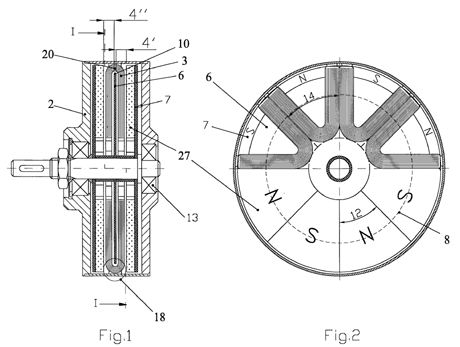 Zeigen eine andere Doppel-Scheibenmaschine, in der etwa 98% des Kupfers vom Feld durchdrungen ist, da auch der Umfangsbereich der Spule mit Magneten bestückt ist: 1. Doppel-Scheibenmaschine (Explosionszeichnung) 2. Axialschnitt zeigt die frei bewegliche Scheibe in der gefalteten Spule und die Magneten im Stirn- und Trommelbereich 3. Nahansicht