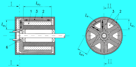 wobei jede Spule möglichst vollständig im Feld liegt. ![]() Glocken-Scheibenmaschine Bei rotierenden Maschinen wird das Optimum durch die Achsannäherung beider Wickelköpfe erreicht. Dies ermöglicht eine nahezu 100%ige Nutzung des Leitungskupfers und deshalb die höchsten Wirkungsgrade. In der folgenden Doppel-Scheibenmaschine werden etwa 90% des Kupfers genutzt.